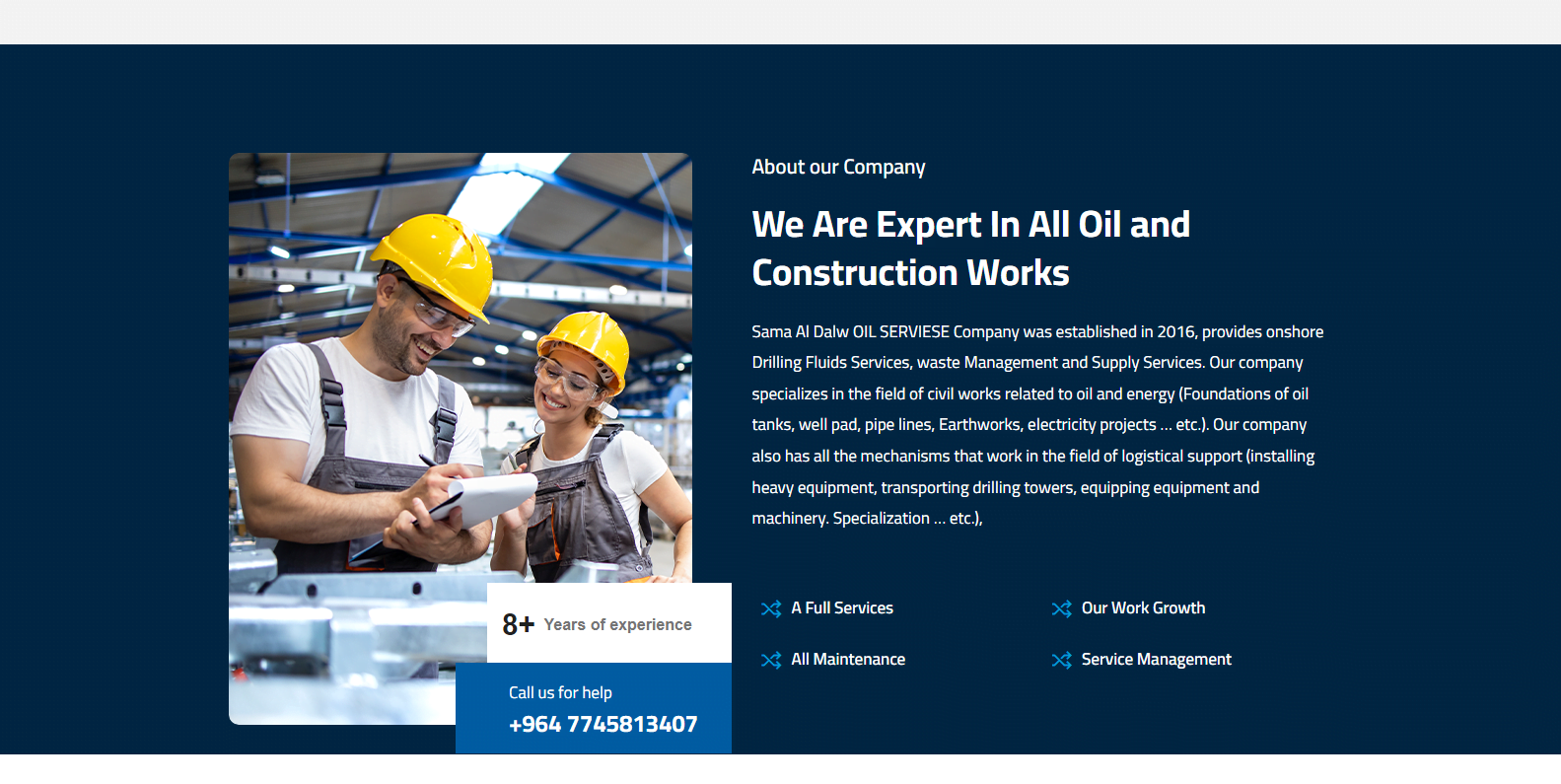 شركة متخصصة في مجال الأعمال المدنية المتعلقة بأساسات النفط والطاقة لخزانات النفط ، ووسادات الآبار ، وخطوط الأنابيب ، وأعمال الحفر ، ومشاريع الكهرباء
